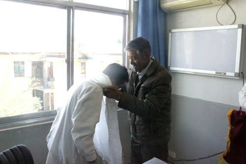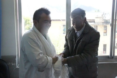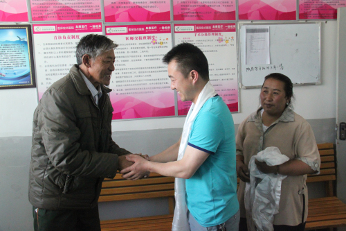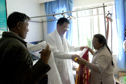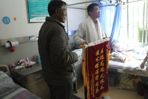患者及家属在出院当天,对我院的骨科医生献上哈达,锦旗表达了感谢之情。