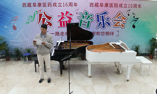 西藏阜康集团董事长王斌致词:“阜康医药发展有限公司走过了十六个年头,阜康医院走过了十个年头,能够取得今天的成就,离不开各级政府部门、社会各界友好人士长期以来对阜康的关心,离不开西藏百姓对阜康的信赖。今天很荣幸邀请到国外友人广濑清隆先生及边天、董乐晨、周于蒨四位音乐家来到西藏为大家公益演出。一路走来,阜康感谢有您相伴,衷心感谢大家,希望到场的朋友们尽情享受这美妙的音乐之旅。”