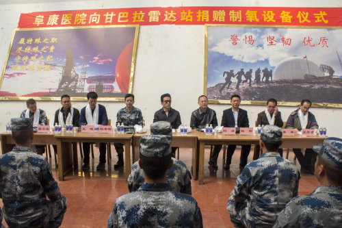 2016年5月11日上午,王斌董事长在捐赠仪式上讲到:“阜康医院自建院以来,始终秉承‘用我们的知识和良知为人类健康服务’的办院宗旨,坚持发展不忘百姓、不忘社会。这次我们向甘巴拉雷达站的子弟兵们捐赠这套制氧设备,希望能够为大家创造更好的工作、生活环境,希望能为驻守祖国边疆的子弟兵们贡献一份力量,在此,我谨代表阜康集团全体员工向驻守在甘巴拉雷达站的人民解放军全体指战员表示最真挚的敬意。”