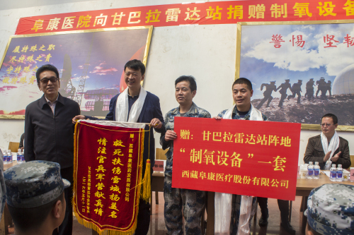阿沛·晋源主席也在捐赠仪式上向驻守甘巴拉雷达站的全体官兵表达了亲切的问候与崇高的敬意,并说道甘巴拉雷达站的官兵们是这个时代最可爱的人,五十多年来,他们一代又一代、一批又一批地驻守在这里,为西藏、为祖国的安全奉献了自己的青春与岁月。阿沛·晋源主席还说道,阜康医疗股份有限公司为甘巴拉雷达站安装制氧设备,体现了阜康集团不忘感恩回报社会,体现了“军爱企、企拥军、军企鱼水一家亲”,感谢阜康以及王斌董事长始终不忘发展中做贡献,感谢王总为找到能在海拔5374米的甘巴拉雷达站正常运转的机器所付出的努力,希望王总能持续跟进捐赠的制氧设备,关心机器的运转情况,做好制氧设备的后续维护等工作,争取能最大程度地、最长时效地发挥该制氧设备的作用,缓解缺氧对甘巴拉雷达站官兵们的身体所造成的影响。