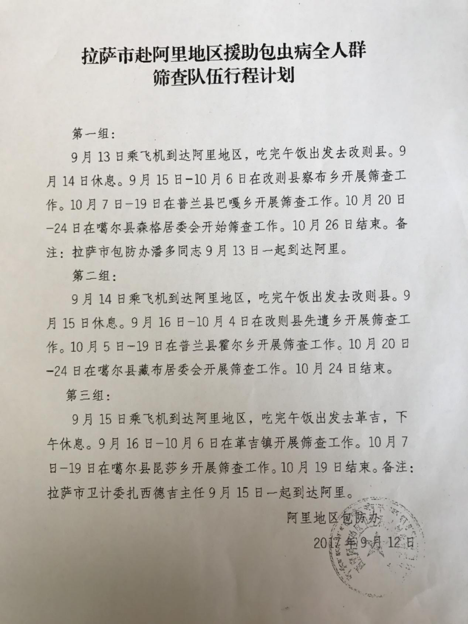 经了解,此次包虫筛查工作,拉萨市卫计委邀请并组织3支共18人的医疗小分队。我院是第三组,分在阿里的革吉镇和噶尔县昆莎乡两个筛查点,共将筛查3564人。另外两组分别是改则县察布乡(2650人)和先遣乡(2050人)。从分配工作计划上看我组分配的筛查人员最多,人员也比较分散,给工作增加了难度,小组预计将9月17日~10月19日完成筛查工作。
