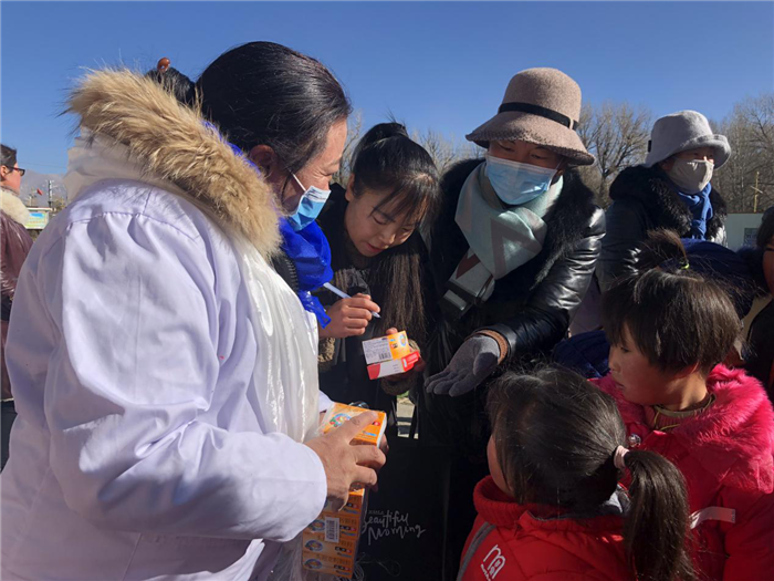 捐赠仪式结束后,阜康医院义诊队为60多名学生免费就诊,发放药品。义诊队医生细心为孩子们看病,并耐心讲解药品的服用方法及注意事项,老师仔细的在每个孩子的药盒上注明孩子姓名及用法。