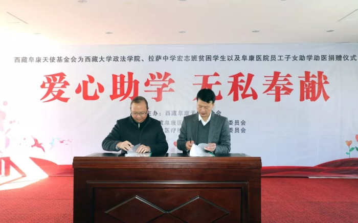 西藏阜康天使基金会理事长、西藏阜康医疗股份有限公司党委书记、董事长王斌与西藏大学政法学院党委书记罗布签订捐助协议