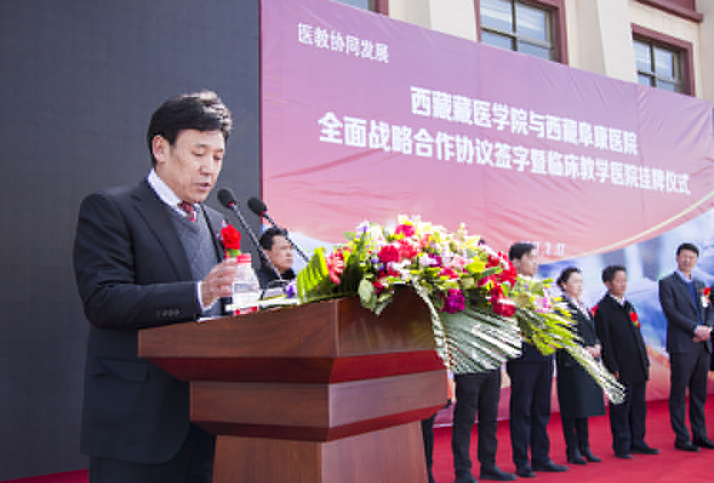 尼玛次仁院长紧接着在仪式中对西藏阜康医院发展至今的企业规模和医疗实力表示了充分的肯定,并表示西藏藏医学院与西藏阜康医院全面战略合作协议签字暨临床教学医院挂牌仪式是一件大事,更是一件有利于双方合作单位共同进步、有利于广大西藏百姓身体健康的好事,合作双方通过医教协同、资源共享、优势互补、共同钻研,必将争取共同攀登上一座又一座医疗领域的高峰,必将争取在征服人类疾病的漫漫长路上走得更快更远。
