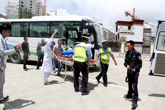 “我公司旅游车藏AL0887去机场途中,在柳梧村附近发生侧翻,有乘客受伤,请求支援。”随着模拟报警电话响起,此次应急演练正式开始。旅游公司、110、120分别接到报警电话后,迅速赶往“事故现场”进行救援,同时,西藏旅游汽车公司也立即启动应急预案。