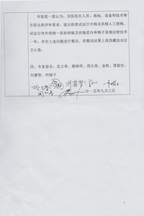 你公司提交的开展人类辅助生殖技术申请,经录入国家辅助生殖技术管理信息审核通过后,系统遴选了7名专家,于2015年9月3日到拉萨市进行实地审核评审。按照专家组提交的评审报告意见,同意你公司在西藏阜康妇产儿童医院(拉萨市罗布林卡路18号),试运行开展精子人工受精、供精人工受精、体外受精-胚胎移植、卵胞浆内单精子显微注射四种人类辅助生殖技术,试运行时间一年。