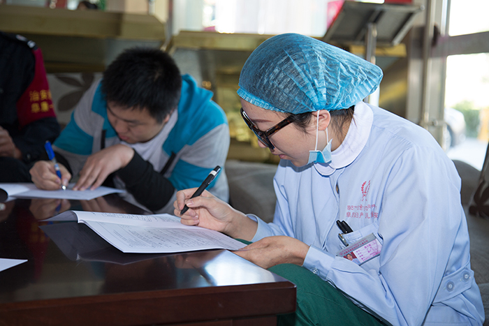 参加献血的医务人员填写表格