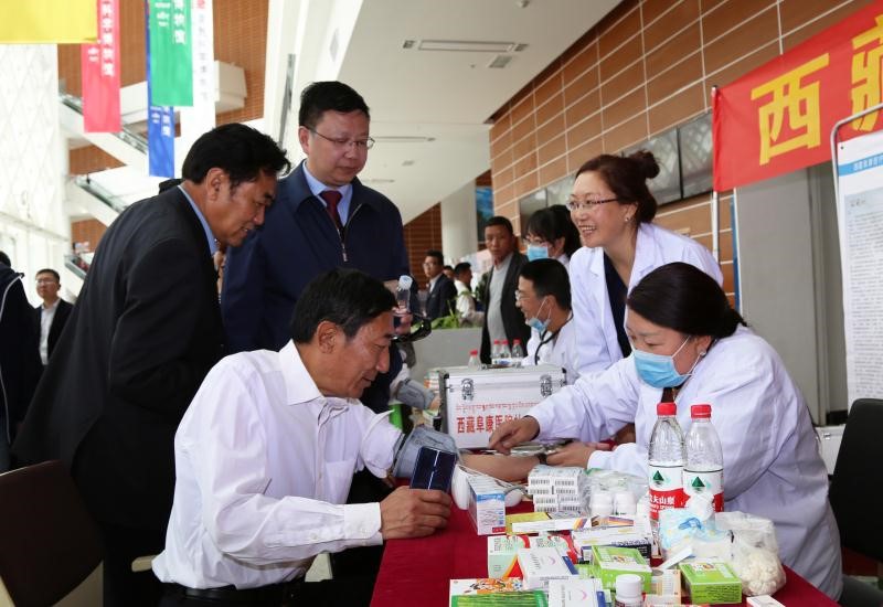 西藏自治区科技厅厅长赤列旺杰在我院展位测量血压