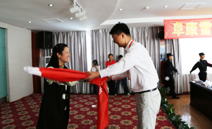 西藏志愿服务联合会副秘书长为阜康雪域天使志愿者服务队授予队旗