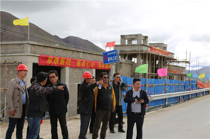 2018年了8月9日,受阜康邀请,西藏自治区政协副主席、区工商联主席、区总商会会长阿沛·晋源,拉萨大昭寺管家洛桑,西藏自治区社会科学院原处长次旺仁青,西藏阜康医疗股份有限公司党委书记、董事长王斌,西藏阜康医疗股份有限公司党委副书记、副总经理陈彬,西藏阜康医院名誉院长嘎布,阜康生殖医学中心实验室主任刘锋,阜康体检中心主检师琼玛,阿沛·晋源主席秘书旦增一行早上8点从拉萨出发,一路颠簸驰骋于下午2点50分许抵达那曲地区嘉黎县夏玛乡。听说晋源主席要来视察卫生院的建设工作,嘉黎县县长吾金不顾受伤的左腿带领当地干部群众早早等候在夏玛乡卫生院建设现场。