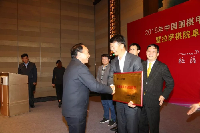 为表彰拉萨棋院阜康职业围棋队对西藏体育围棋事业做出的巨大贡献,西藏自治区党委副书记、主席齐扎拉代表党委政府向拉萨棋院阜康职业围棋队领队王斌颁发了“西藏自治区体育棋类贡献奖”!肯定了阜康四年来支持拉萨棋院积极参与全国各项赛事并为围棋在西藏的普及发展所做出的诸多工作。勉励王斌继续支持西藏的围棋发展,一步一个脚印地做好医疗卫生和体育文化工作。