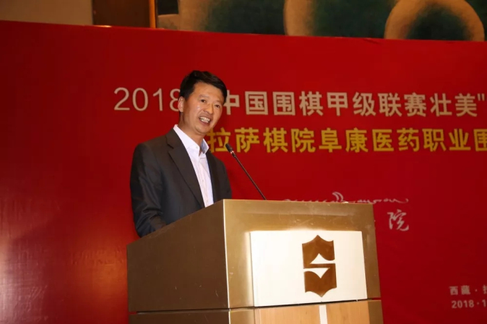 西藏自治区政府副主席甲热·洛桑旦增代表自治区人民政府对各位嘉宾的到来表示热烈欢迎。他说围棋是一切棋类运动的鼻祖,是中华民族优秀传统文化的瑰宝,融合了军事、哲学、诗词等多种文艺形式,是中华民族几千年来智慧的结晶,也是对人类文明的重要贡献。在建设社会主义文化强国、体育强国、实现中华民族伟大复兴的中国梦进程中,围棋这样一项由文化融进体育的智慧运动承担着重要的历史使命。拉萨棋院西藏阜康医药职业围棋队冲甲成功是西藏体育发展的重大突破,也是社会力量推动体育事业发展的典范。为此我代表自治区人民政府对西藏阜康医药职业围棋队冲甲成功表示热烈祝贺,对社会各界支持西藏体育事业发展表示感谢,自治区政府将加快推进体育事业改革、做强做大体育产业,促进全区体育事业再上台阶。祝愿2018年中国围棋甲级联赛壮美“第三极”西藏专场取得成功,祝愿西藏阜康医药职业围棋队在明年的甲级联赛中取得更好成绩。