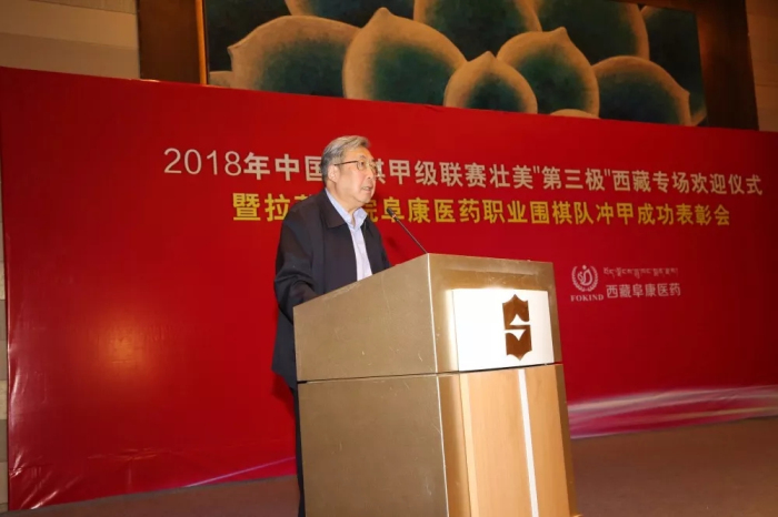 中国围棋协会主席林建超将军在致辞中表示,拉萨棋院西藏阜康医药职业围棋队冲甲成功是全国围棋运动中的一件大事。它首先改变了当代中国围棋运动的版图,雪域高原第一次在中国围棋甲级联赛中占有了一席之地;其次,这次冲甲实现了西藏体育发展的一次突破,使西藏在全国性的体育赛事中,拥有了第一支甲级职业队伍;第三,本次冲甲成功,为围棋文化和藏式棋类文化的交融促进提供了一个很好的契机,为西藏地区棋文化的发展起到了很好的推动作用。这项成绩来之不易,首先应该归功于自治区各级党委、政府的重视,尤其是齐扎拉主席长期以来对包括围棋、藏式棋等棋类活动的支持,有效促进了这项中华民族优秀传统文化在雪域高原的普及与发展,这是与习近平总书记在十九大报告中提出的战略目标相一致的。