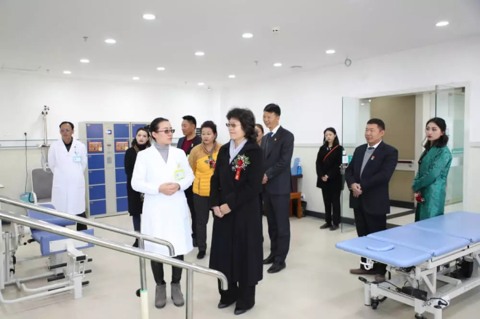 自治区民政厅党组成员、副厅长牛玉枝,拉萨市卫生和计划生育委员会党委副书记、主任扎西德吉,西藏自治区民政厅社会福利和社会事务处处长王大军,西藏阜康医疗股份有限公司党委书记、董事长王斌共同为西藏阜康医院医养结合中心揭牌。之后牛玉枝、扎西德吉、王大军、王斌及出席仪式的各位领导参观了阜康医院医养结合中心。