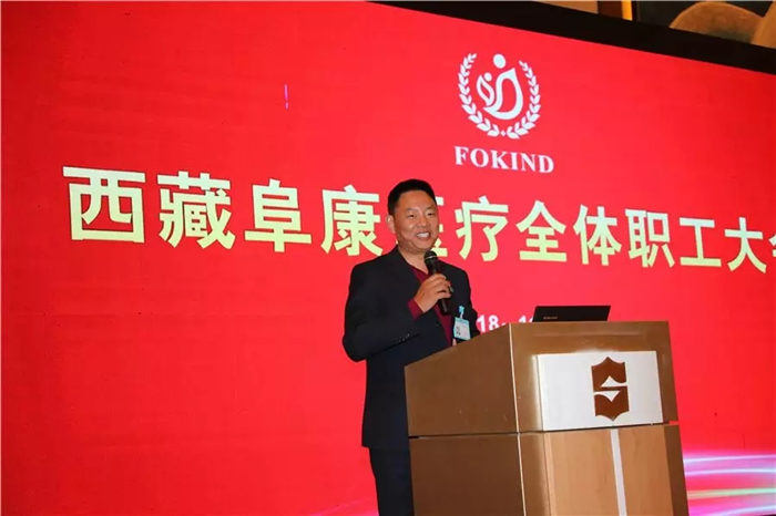 最后,西藏阜康医疗股份有限公司党委书记、董事长王斌就医院工作做重要部署。根据阜康医疗快速发展的现状以及符合现代化、标准化管理的要求,王斌分享了他对公司实行扁平化管理、医院组织架构进行调整的相关设想,就“集团总部人员配置”、“医院院区人员配置”、“公司领导安排”、“管理者的临床业务时间分配”、“院区财务,人事,科研教学” 、“未来组织架构”等方面规划思路向各位领导及员工进行了分享。