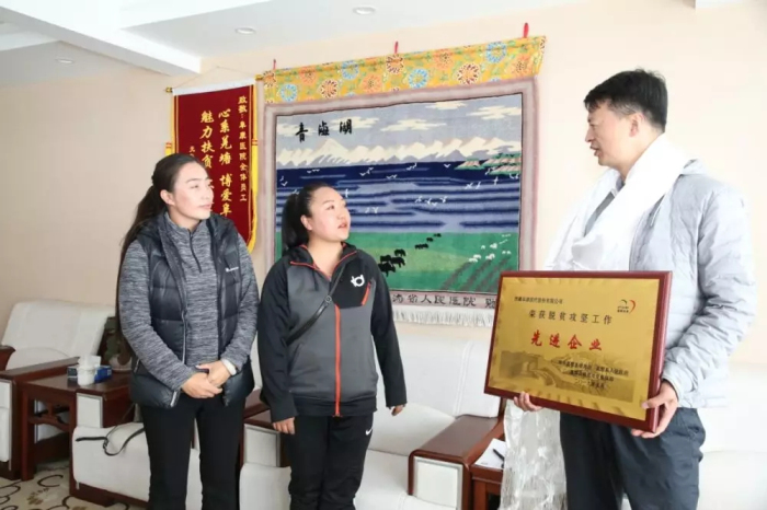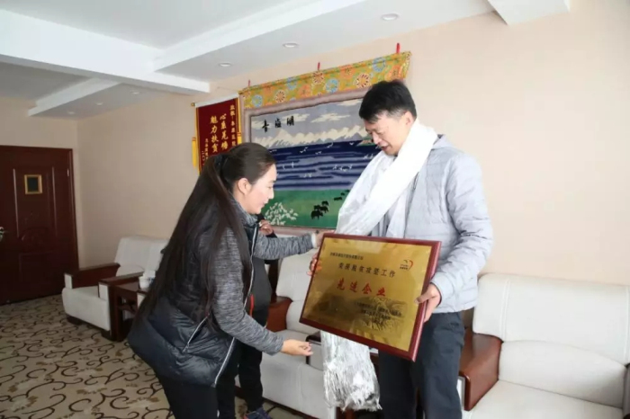 随后,才旦卓嘎向阜康医疗股份有限公司党委书记、董事长王斌颁发“脱贫攻坚工作先进企业”匾牌。