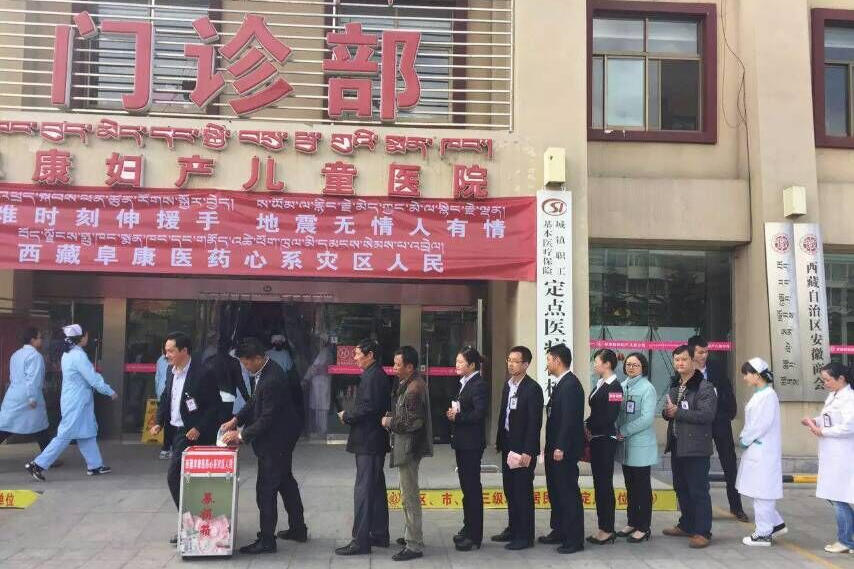 在得知尼泊尔地震后第一时间,阜康医药发展有限公司携西藏阜康医院、阜康医院妇产儿童分院、阜康医院心脑血管分院、阜康(国际)健康体检中心以及旗下各大药房举行了灾区捐款仪式。
