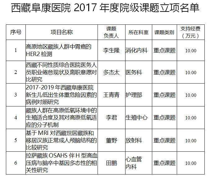 这是我院首次组织申报并批准立项的院级课题。课题主持人均为我院医务人员。本年度立项资助的6个课题均为院级重点课题,每项课题将提供10万元的研究经费。课题自2017年10月1日正式实施,期限为两年。