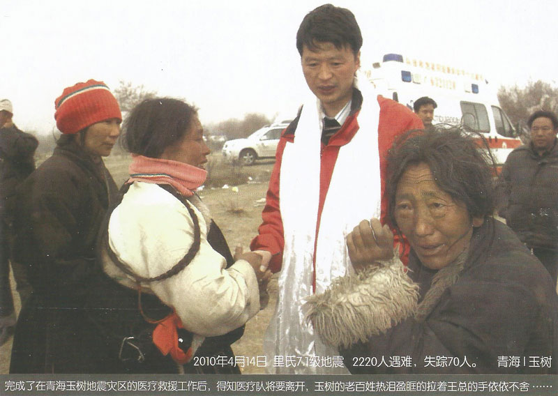 2008年5月12日14时28分,在得知发生在四川汶川8级的强烈地震后,王斌被深深的震撼了,5月13日第一时间带头捐款并号召全公司347名员工为灾区人民献爱心,在王斌的带领下短短的一上午公司即向西藏红十字会捐款10062万元(其中王斌个人捐款5062万元)。13日下午,王斌随即召开阜康医院医务人员赶赴灾区医疗救援动员大会,并迅速组建了一支由他本人作为领队的26人医疗救援队。同时他还带领医疗队为尽快抵达地震灾区并第一时间参与医疗救援,而且决定在成都临时购买一辆配备完善的救护车,还包括大量药品、生活物品、以及部分医疗设备,此次救灾共投入130余万元。