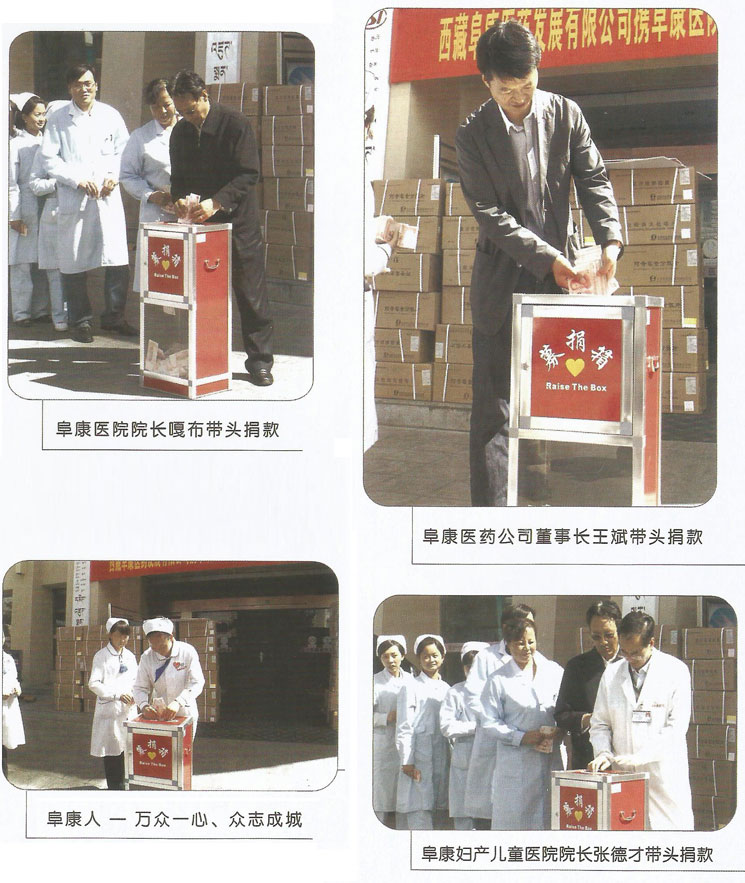 2011年9月8日,印度锡金发生了6.8级地震,地震造成了亚东县供水、供电、交通、通信等度全部瘫痪。灾情牵动所有西藏人民的心,更牵动着阜康人的心。25日,为了支援灾区,阜康医药发展有限公司携阜康医院、阜康妇产儿童医院以及旗下医药超市举行了为亚东地震灾区捐款仪式。在捐款现场,一箱箱捐助药品整齐地堆放在起,捐歉员工排着整齐的队伍有序的走到捐款箱边,把自己的捐款投入到箱中。