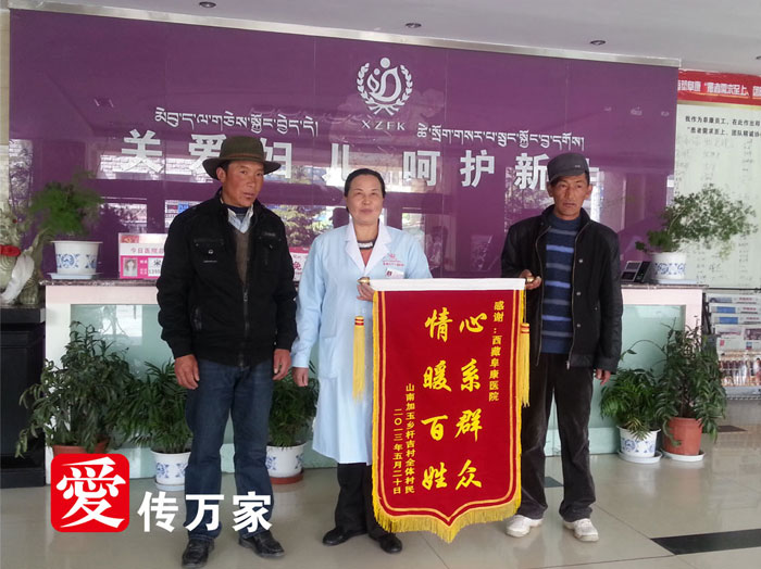 2013年5月22日阜康妇产儿童医院门诊大厅,山南加玉乡杆吉村的塔杰书记激动地握着吕果梅院长的手,不停地说着感谢的话,他的身边站着杆吉村的扎西村长,村长手上拿着一面锦旗,锦旗上面写着“心系群众 情暖百姓”。