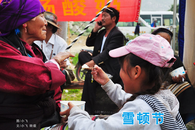 雪顿节,是西藏最隆重的节日,千千万万的佛教徒从全世界涌向拉萨,以最虔诚的心、一步个顶礼膜拜,朝拜至高无上的佛祖。佛教信徒们到山上去修行,修行完毕时家里的亲人带着酸奶到山上去迎接他们,在回家的路上人们吃酸奶、跳舞、唱歌。