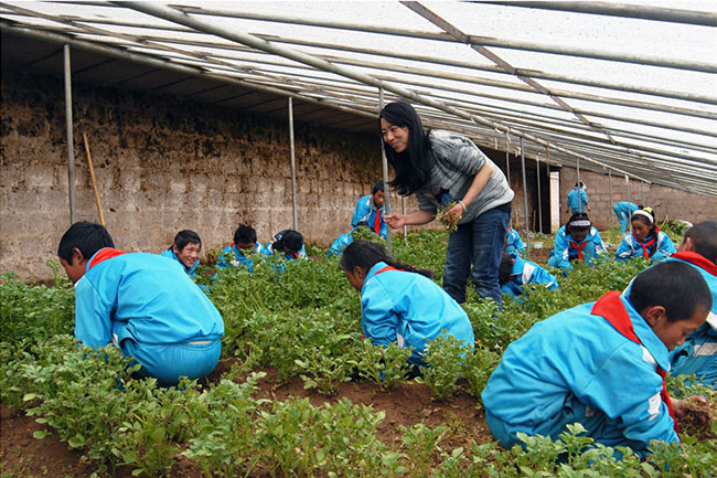 图:白觉措带领学生们在温棚劳动