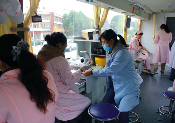 前来参加此次献血活动的人员来自西藏阜康医药发展有限公司下属的各医院、药房。有些甚至跟同事换了班过来献血。同志们在门诊大厅领表单,填好表之后到献血车前排队等待献血。依次序登上采血车,从验血型到采血人员处献血。现场气氛热烈,秩序井然。受到献血现场气氛的感染,住院家属以及附近警务站的警察也加入到献血队伍中来。