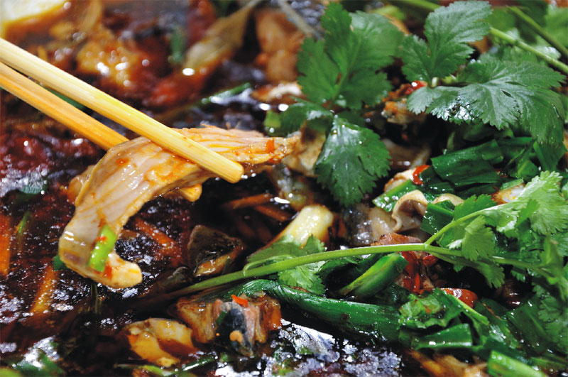 广东人喜欢煲汤,却把老火汤里丰富的汤料称为汤渣,一般只作为正菜前的消遣而已。四川人的炖菜则是绝对的主角,无论是家里的餐桌还是饭店的酒席,一般上了炖菜,也就意味着宴席进入高潮。过去,家里最喜欢做海带炖鸡,老母鸡加海带,拍几片生姜,扔一束香葱,快起锅的时候洒一些盐,汤清肉香,老远闻到就忍不住想去揭一下锅盖。那时,我最得意的是用小碟子,只放一些干辣椒粉和盐,舀一小勺鸡汤拌匀了,做成蘸水,随手揭一块鸡皮在蘸水里一裹,滋味纯粹而浓烈,让人每次想起,都忍不住要闭上眼睛猛吸一口气,仿佛那味道又在舌尖上打转。