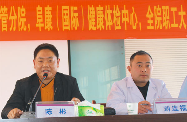 大会开始王斌董事长向大家隆重介绍陈彬总经理,陈彬总经理与阜康结交十年,阜康医院创院伊始便就职于阜康从事管理工作。陈彬总经理军人出身,作风强硬,相信在他的带领下,未来三年阜康将会有更加明显的变化和辉煌的成就。王斌董事长作阜康2015年度工作安排和年度计划: