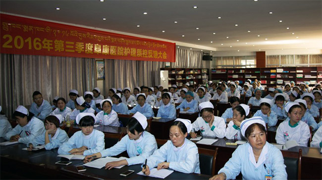 2016年9月23日下午16点整,西藏阜康医院2016年第三季度护理质量反馈大会,在阜康妇产儿童分院四楼会议室进行。阜康医院、阜康妇产儿童医院、阜康心脑血管医院及阜康体检中心全体护士共130人参加了本次会议,会议由敖德秀总院长主持,在会议上院长就2016年我院护理质控工作中存在的问题进行了分析并提出对策。
