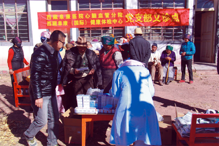 2016年11月18日,在西藏阜康医院有限公司党委的领导和支持下,西藏阜康心脑血管分院及体检中心党支部奔赴甘曲镇巨容村开展免费义诊活动。此次义诊活动由内科主任唐小燕带队,内科、中医科的医疗队人员共5人参与,接诊乡民200多人次,赠送药品价值5000多元。此次活动在一定程度上解决了部分村民看病难、看病远的实际困难,让当地群众倍感温暖。