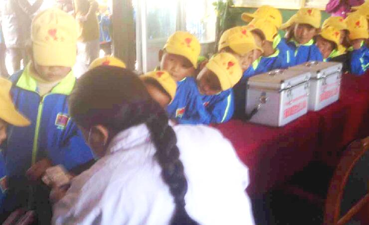 5月31日,受拉萨晚报社驻墨竹工卡县甲玛乡赤康村工作队的邀请,由才仁、卓玛次仁带领的西藏阜康医院社区义诊队来到甲玛乡中心小学,为小朋友送来“健康大礼包”。本次活动共计285名学生接受体检,带去20多种药品价值约25000元。一声温馨的提醒,一盒充满爱意的药品,都让孩子们感受着全社会的关爱。