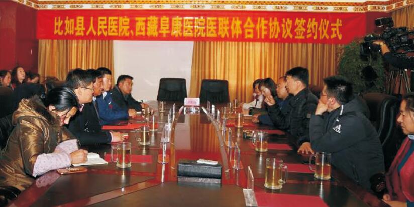 下午签约仪式由县委常委杨复洪主持,阜康医院党委书记兼董事长王斌与比如县卫计委主任兼人民医院院长刘琳共同签署了组建医疗“联合体”的协议。 以缓解当地群众看病远、看病难,并提高当地医疗技术水平,签约仪式结束后王斌在刘琳院长的带领下参观了比如县人民医院、藏医院等地。